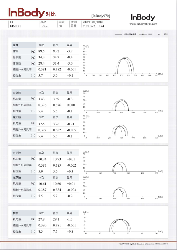 考虑到细胞膜通过程度随频率而产生差异,InBody970测量从1kHz的低频,到业内首个3MHz的高频,准确测量细胞外水分和总水分。此外,通过提高5、50、250kHz相位角各部位的精密测量技术,可以准确地对各种疾病症导致的水肿进行准确的测量和监控。Cole-Cole plot图可体现出InBody的准确度。