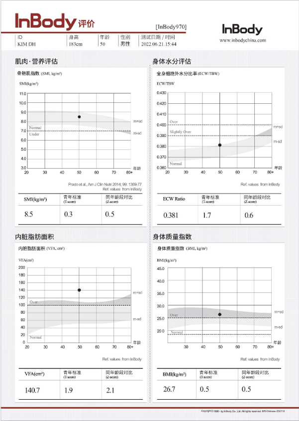 通过InBody大数据,可以将受试者的体成分状态与同一年龄段的InBody结果进行比较,评价其所处的相对位置