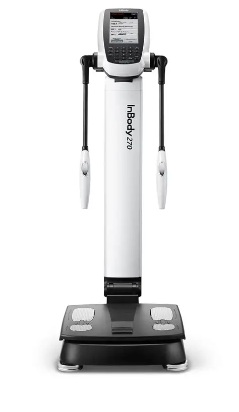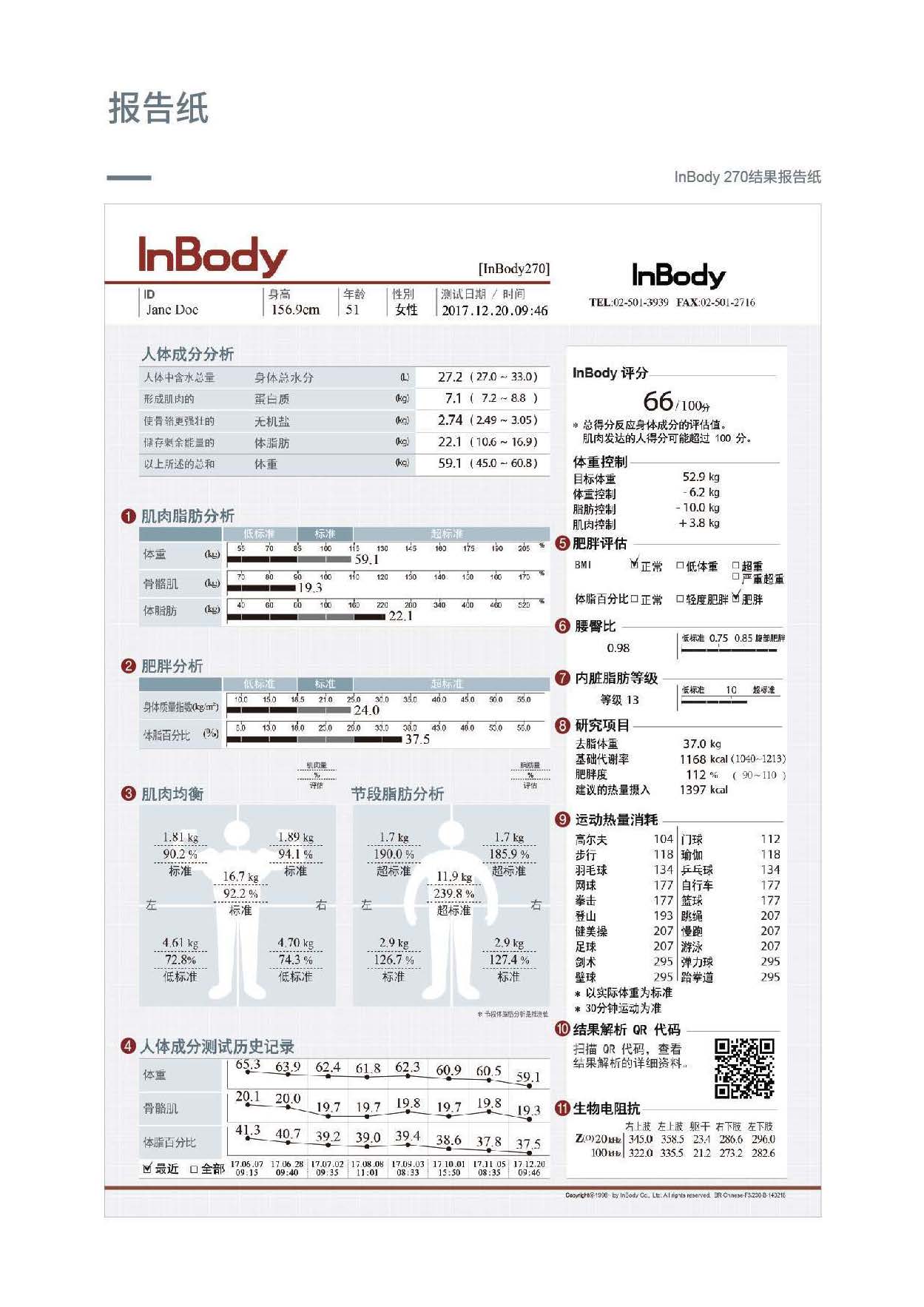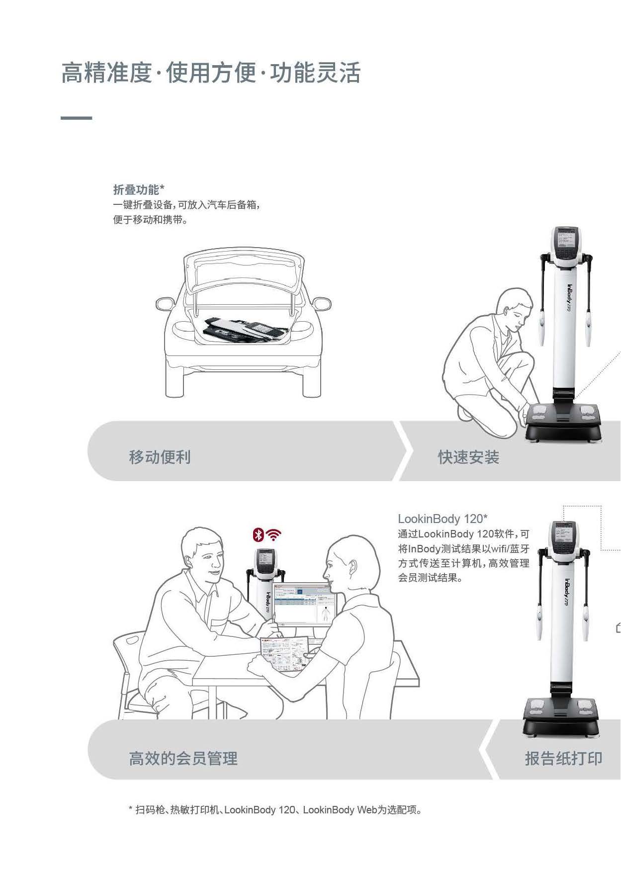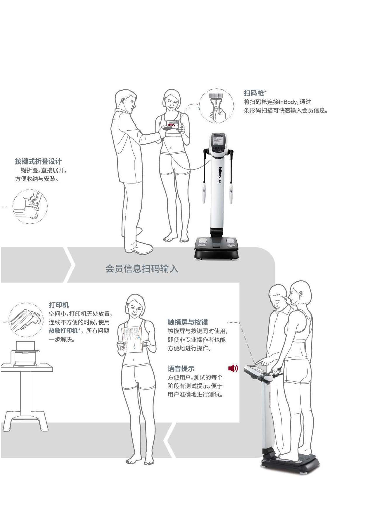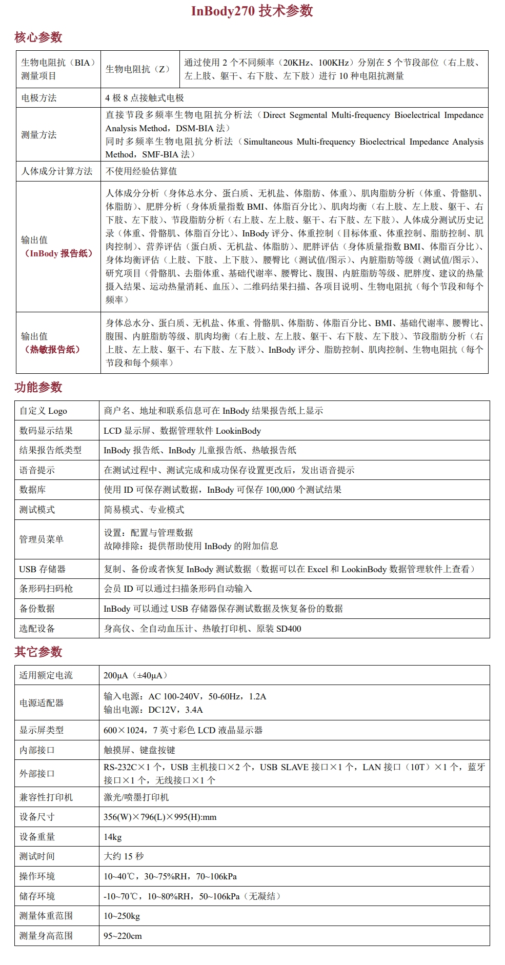 InBody270 方便移动携带的智能型人体成分分析仪 确保检测结果准确的InBody技术专利 获得世界专利认证的直接节段电阻抗测试法(DSM-BIA) InBody直接节段电阻抗测试法(Direct Segmental Multi-frequentcy-Bioelectrial Impedance Analysis,DSM-BIA)是指分别测量上肢、下肢和躯干电阻抗的技术。对各种形态、密度、横截面的上肢、下肢和躯干分别进行测试。相比其它设备,更能够准确地对身体各部位的成分进行分析。 保证测试结果准确性的多频率测试法 多频率测试法是通过1kHz~1000kHz间的多种频率精确测定细胞内、外水分的技术。不同频率穿透细胞膜的程度不同,因此使用多种频率可对其进行区分,分别测定细胞内和细胞外的水分。该技术在肾内科以及康复治疗领域正被广泛应用。 实现高度再现性的8点接触式电极法 InBody充分考虑到人体形态,在双手双脚处均设置了电流和电压电极,总共8个接触电极。分离电流与电压,并使其每一次测量都始于身体的同一位置(手腕、脚腕),最大限度提高了测试的再现性。同时,将皮肤接触阻抗的影响降到最低,确保测量结果的准确性。 不使用经验估算值,准确测量各种特殊体型 InBody在人体成分测试中不使用性别、年龄等经验估算公式,仅通过电阻抗测试直接分析测试者的身体成分,可准确把握身体变化,不漏过任何微小细节。因此,在需要持续观察人体成分变化的治疗及研究领域,InBody备受青睐。 准确度 以InBody公司20年的技术实力确保准确的检测结果 99%重复性 人体工学设计的电极位置保证重复性高达99% 使用便捷 一键折叠,方便移动及安装